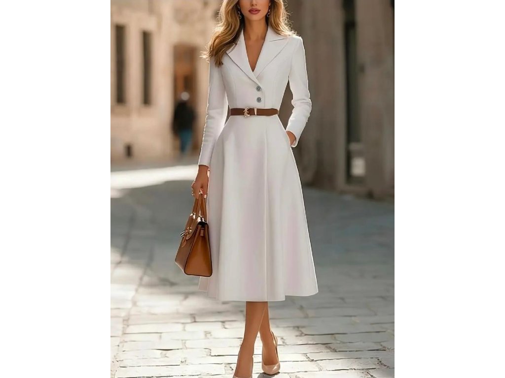 Nadčasová elegance, ženská silueta a špetka luxusu ✨ Tyto bílé sakové šaty v midi délce jsou dokonalou volbou pro ženy, které chtějí vypadat upraveně, sebevědomě a stylově – ať už míří do práce, na schůzku nebo slavnostní událost.