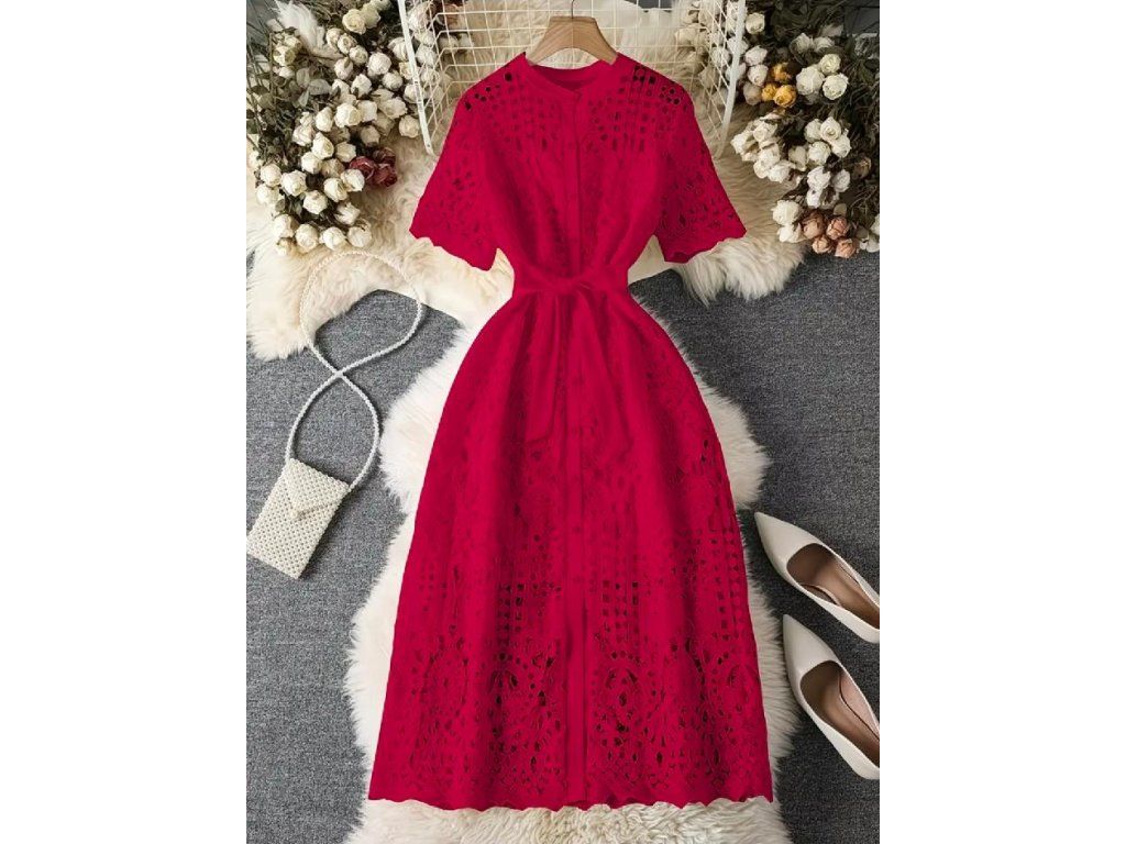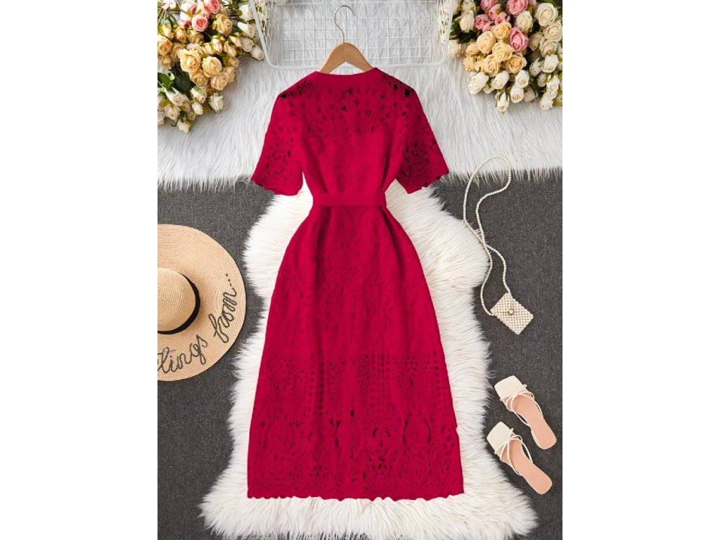 Elegantní krajkové midi šaty s páskem – červené
