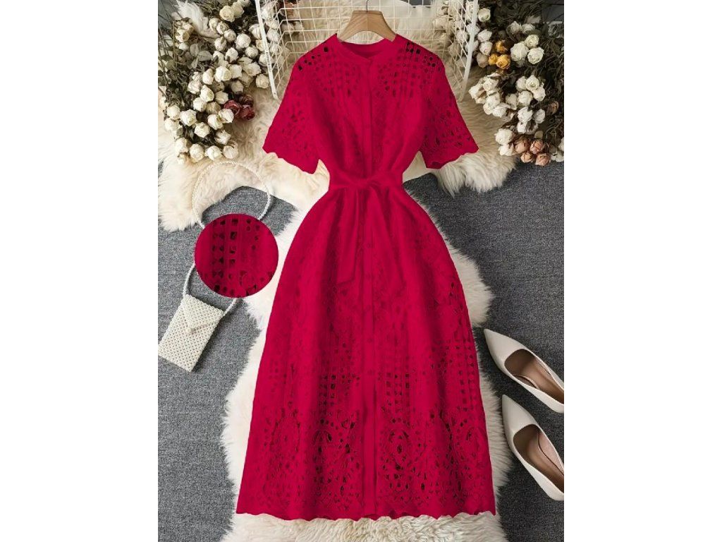 Tyto šaty jsou dokonalým spojením ženské elegance, romantiky a výrazného stylu. Bohatá krajková struktura vytváří luxusní vzhled a výrazná červená barva dodává modelu sebevědomý a nepřehlédnutelný charakter.