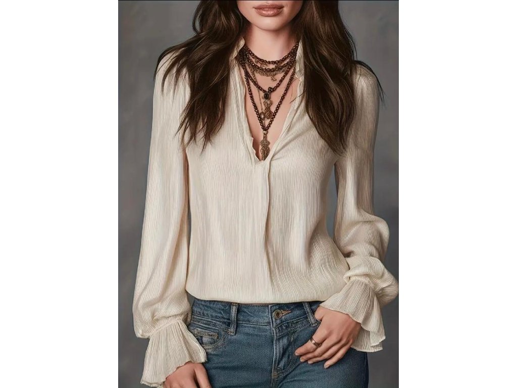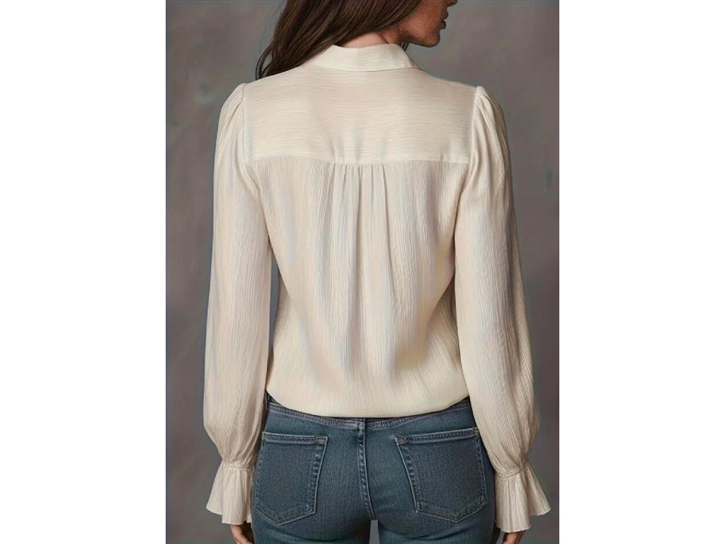 Nadčasový kousek, který v sobě spojuje ženskost, eleganci a pohodlí. Tato krémová košile s lehce strukturovaným materiálem a efektními rukávy působí luxusně, ale přitom je velmi snadno kombinovatelná. Hodí se do práce, na schůzku i na večer – stačí vyměnit doplňky.