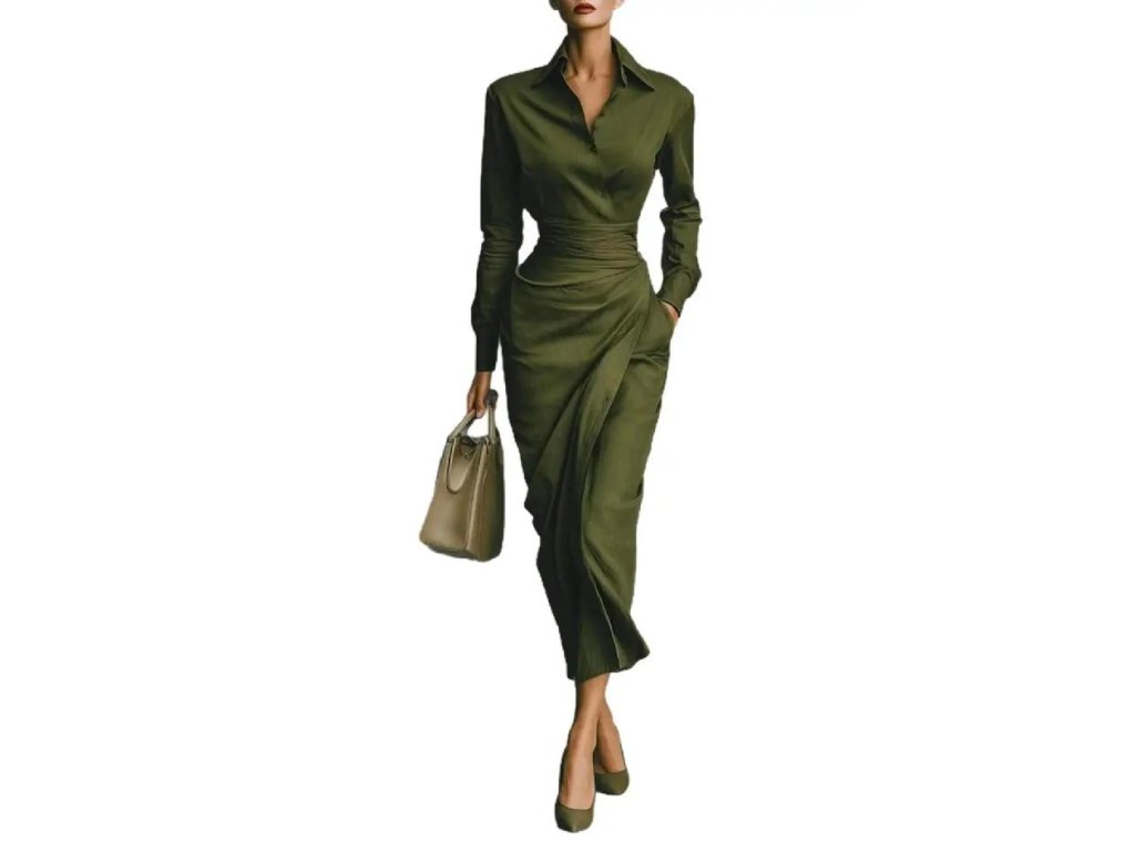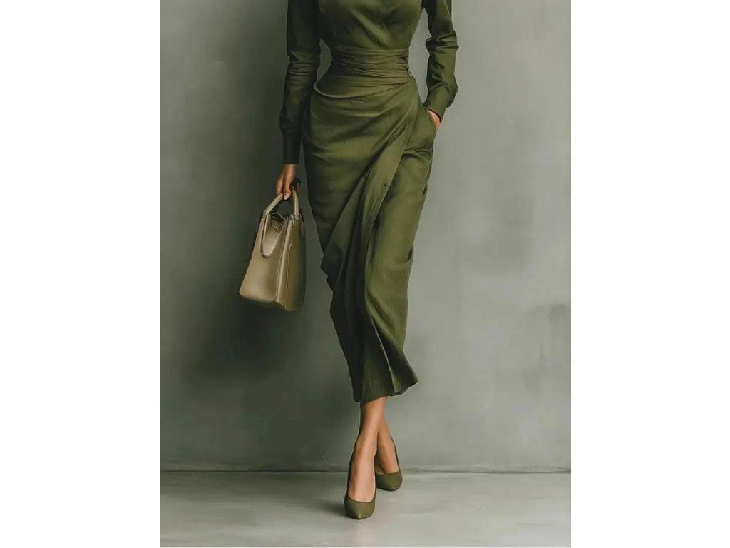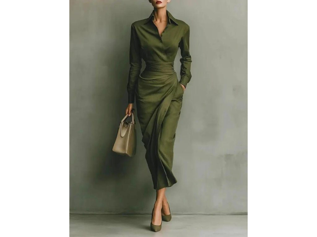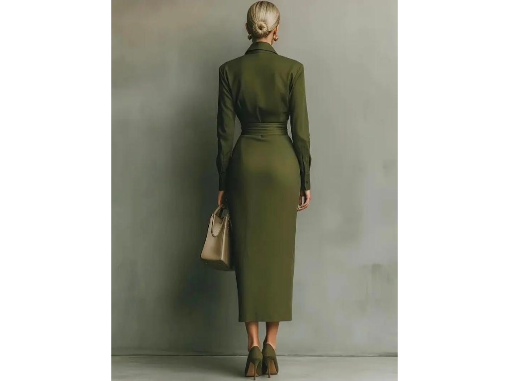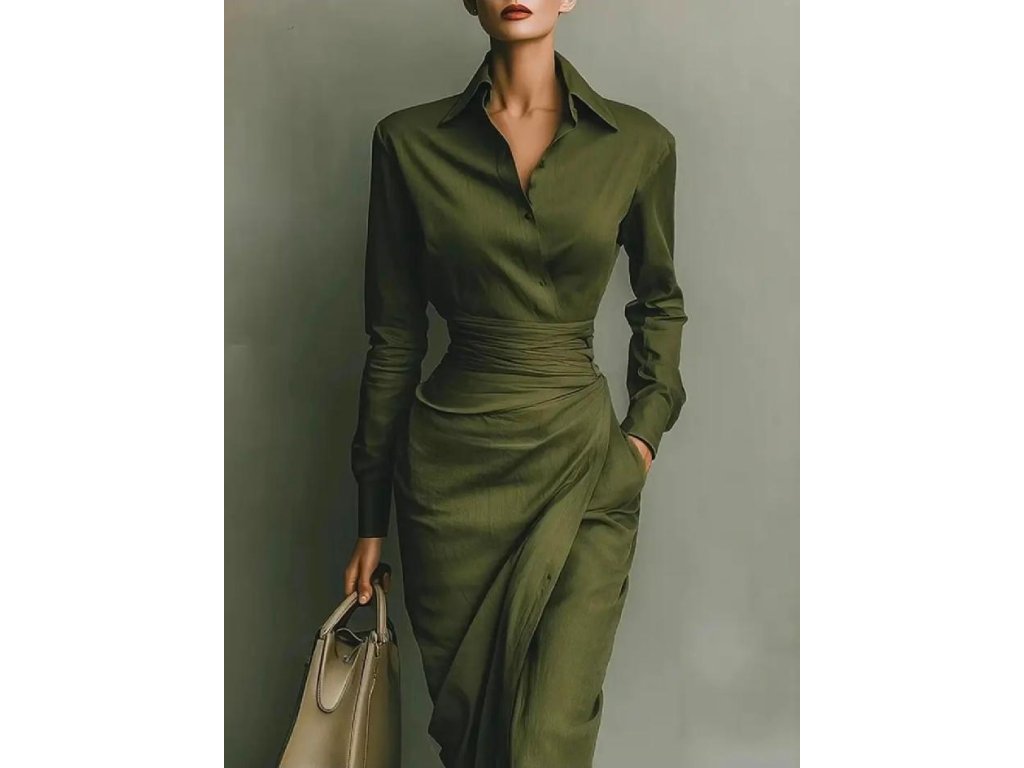 Nadčasové olivové šaty v košilovém stylu, které dokonale kombinují ženskou eleganci a moderní minimalismus. Lehký, splývavý materiál krásně kopíruje postavu, zatímco rafinované zavazování v pase zvýrazňuje siluetu a opticky zeštíhluje.