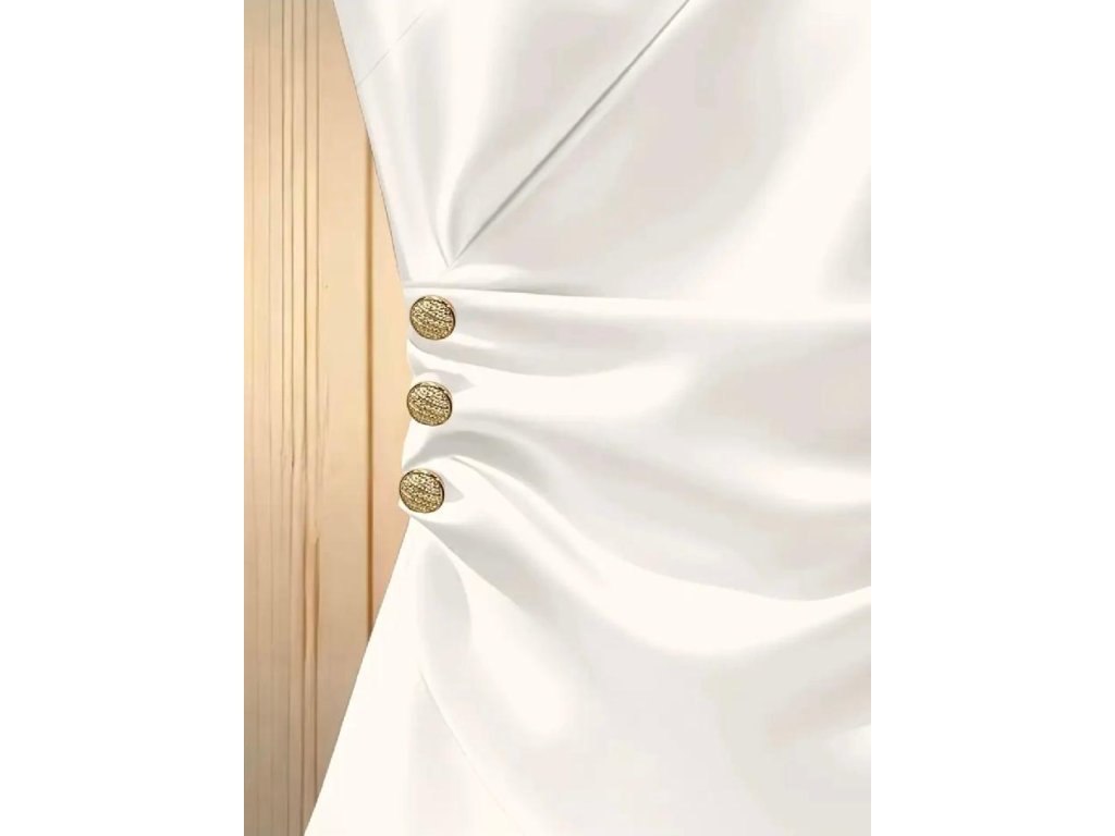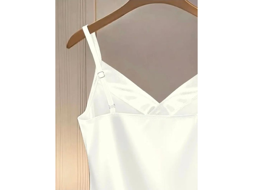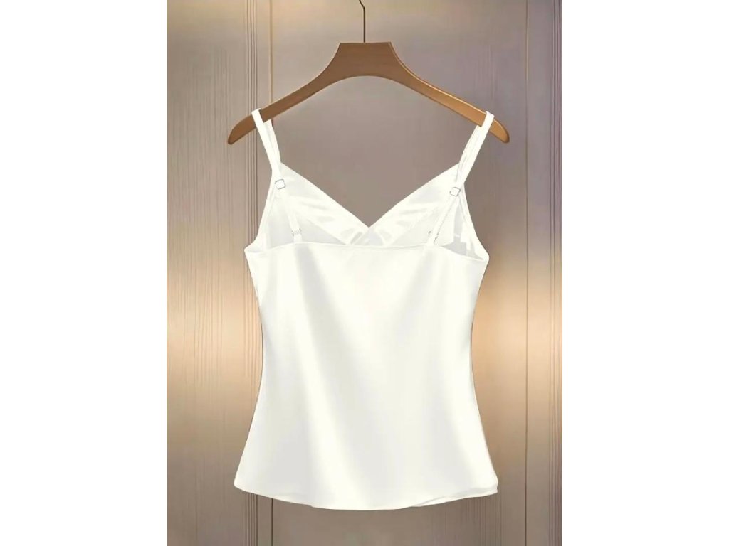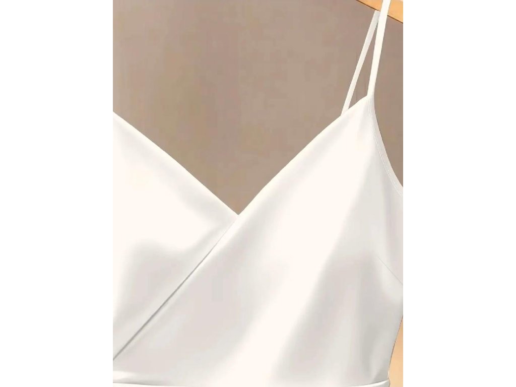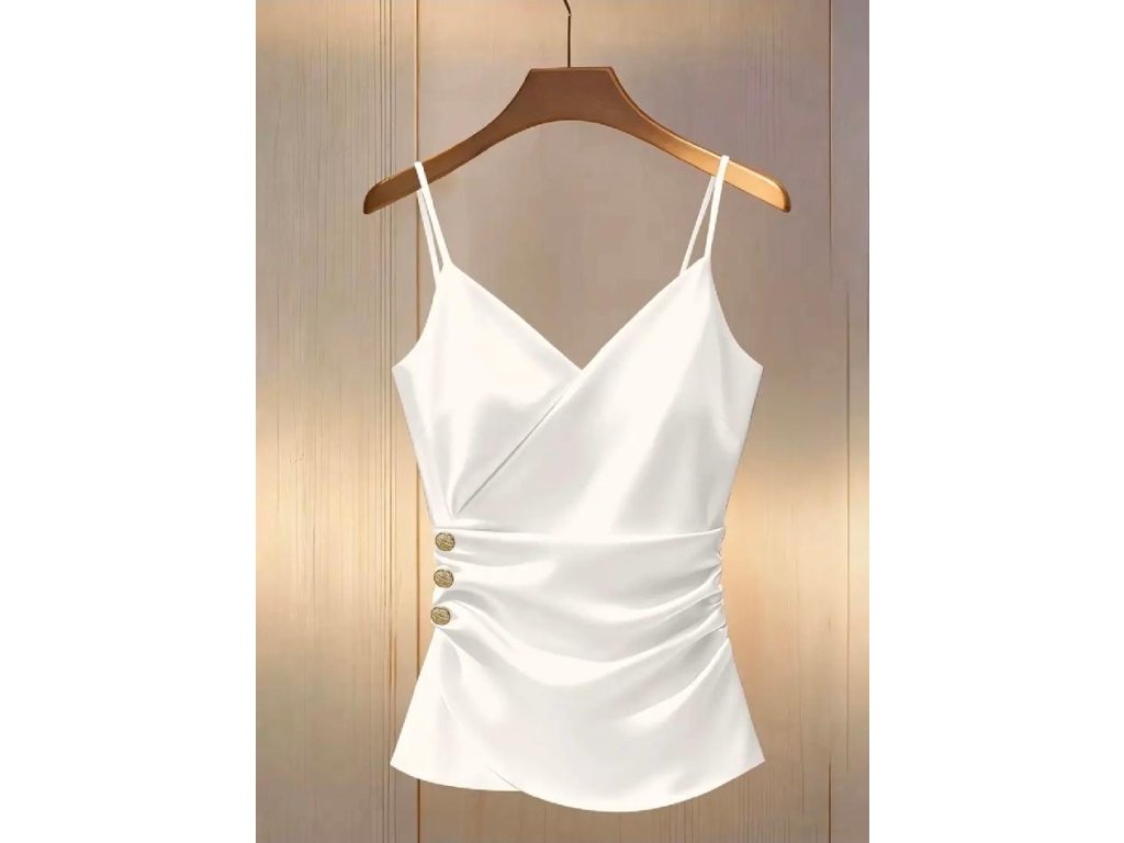 Minimalistický kousek, který udělá velký dojem. Tento elegantní top na jemná ramínka krásně zvýrazní dekolt díky překříženému výstřihu do V a zároveň lichotí postavě díky projmutému střihu. Decentní knoflíky na boku dodávají topu šmrnc a luxusní nádech.