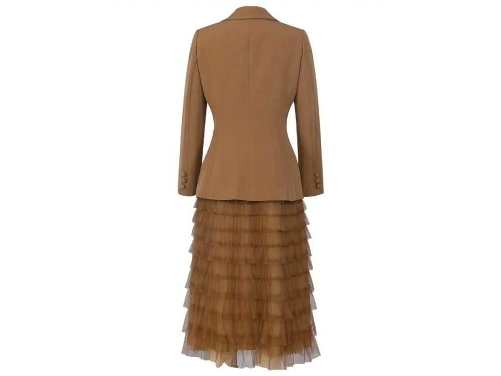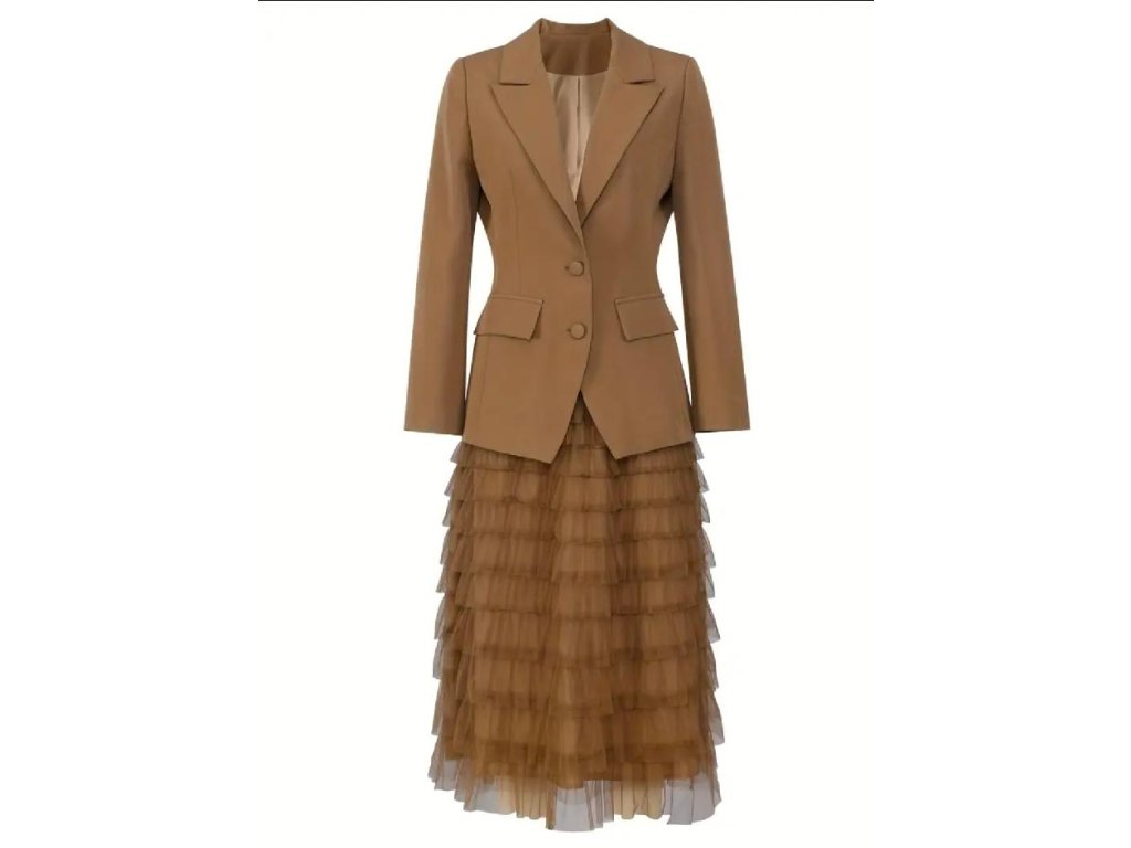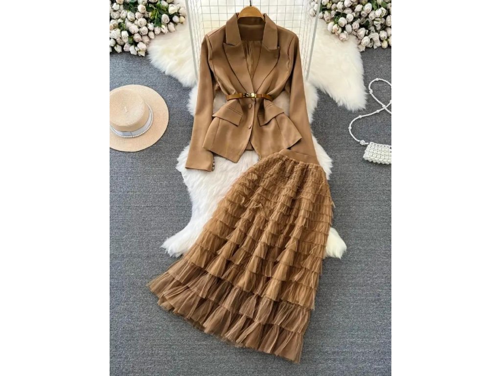 Stylový dámský komplet, který zaručeně upoutá pozornost. Elegantní sako s projmutým střihem krásně zvýrazní pas, zatímco jemný pásek dodává outfitu sofistikovaný a ženský vzhled. Vrstvená tylová sukně působí lehce, vzdušně a přináší do celého looku romantický nádech.