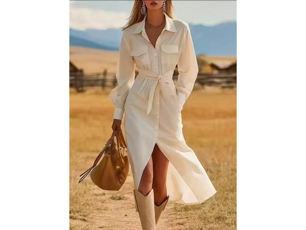 Šaty mají klasický košilový límeček, zapínání na knoflíky po celé délce a dlouhé rukávy zakončené manžetou. Rozparek ve spodní části dodává modelu lehkost a sofistikovaný ženský nádech.