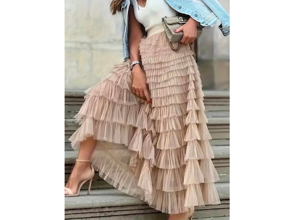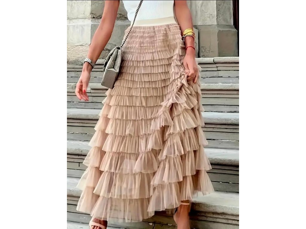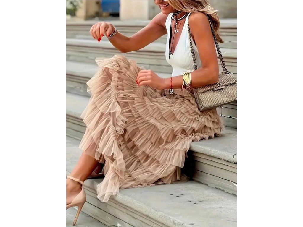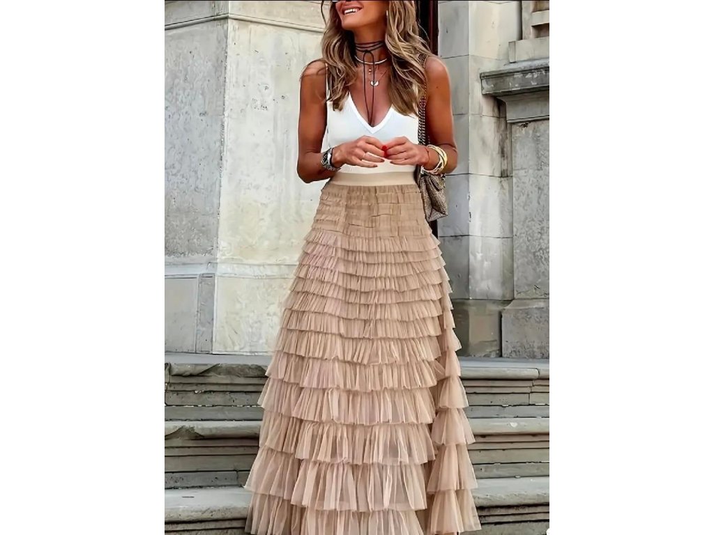 Sukně je vyrobena ze 100 % polyesteru. Materiál je lehký, vzdušný a příjemný na nošení. Jemná síťovaná tkanina s vícevrstvými volány vytváří krásný pohyb při chůzi a dodává sukni romantický, boho vzhled. Materiál je nenáročný na údržbu a dobře drží tvar.