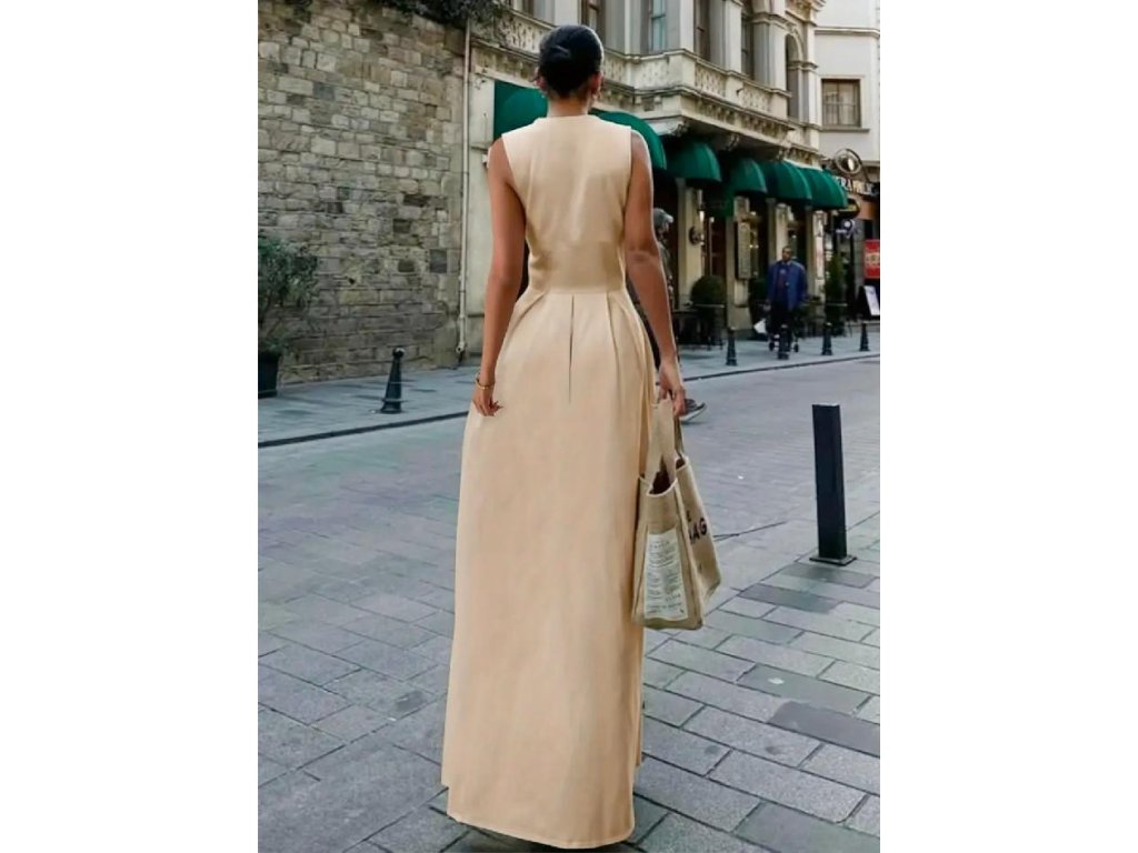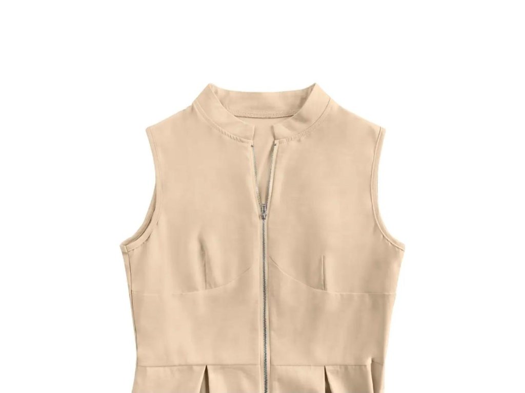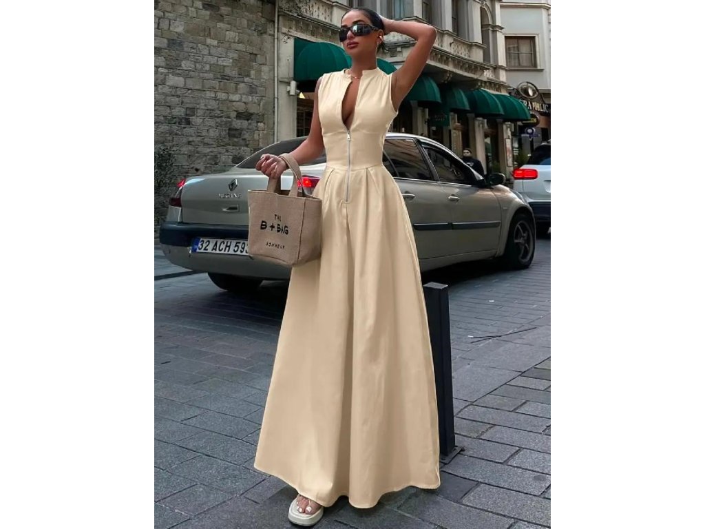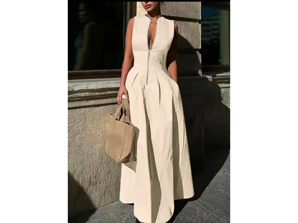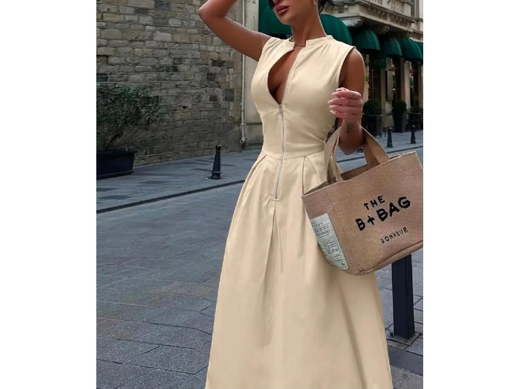 Výrazný zip v přední části umožňuje regulovat hloubku výstřihu a dodává modelu jemně smyslný nádech. Šaty jsou bez rukávů, ideální na teplejší dny, letní večery, dovolenou, ale i slavnostní příležitosti či stylové městské nošení.