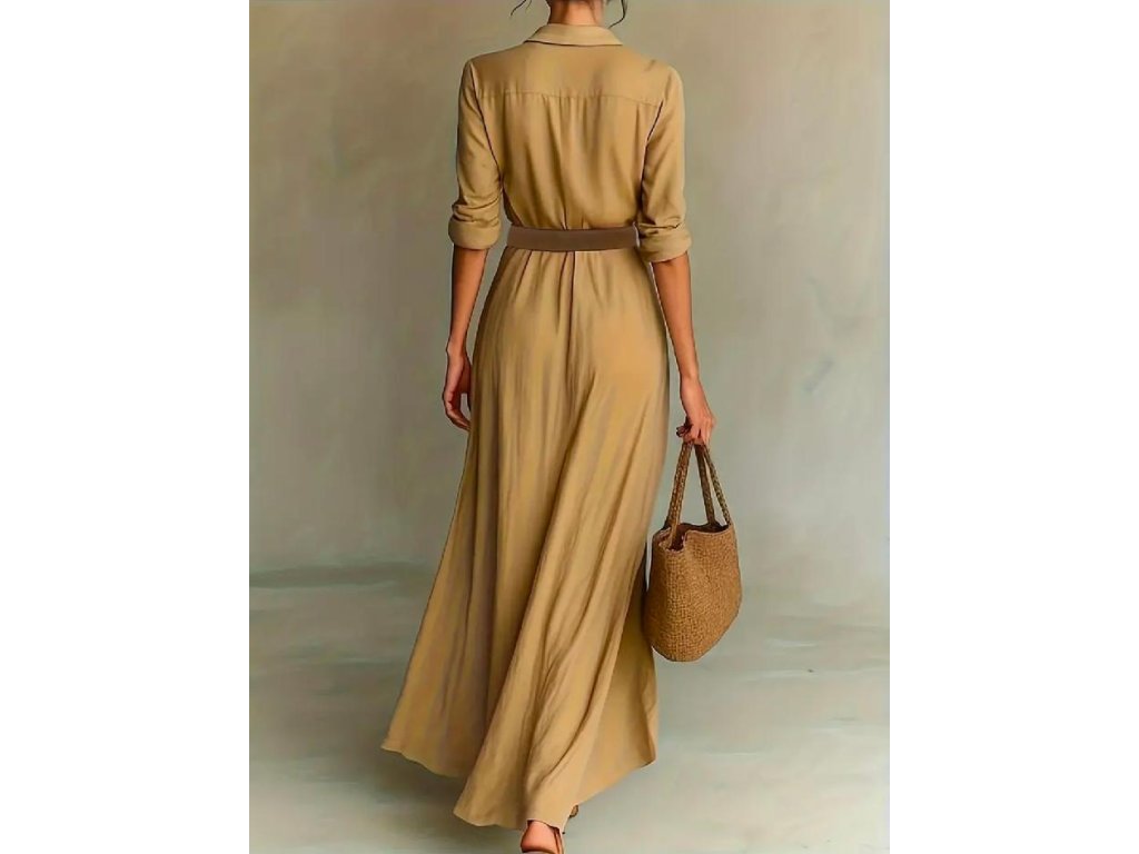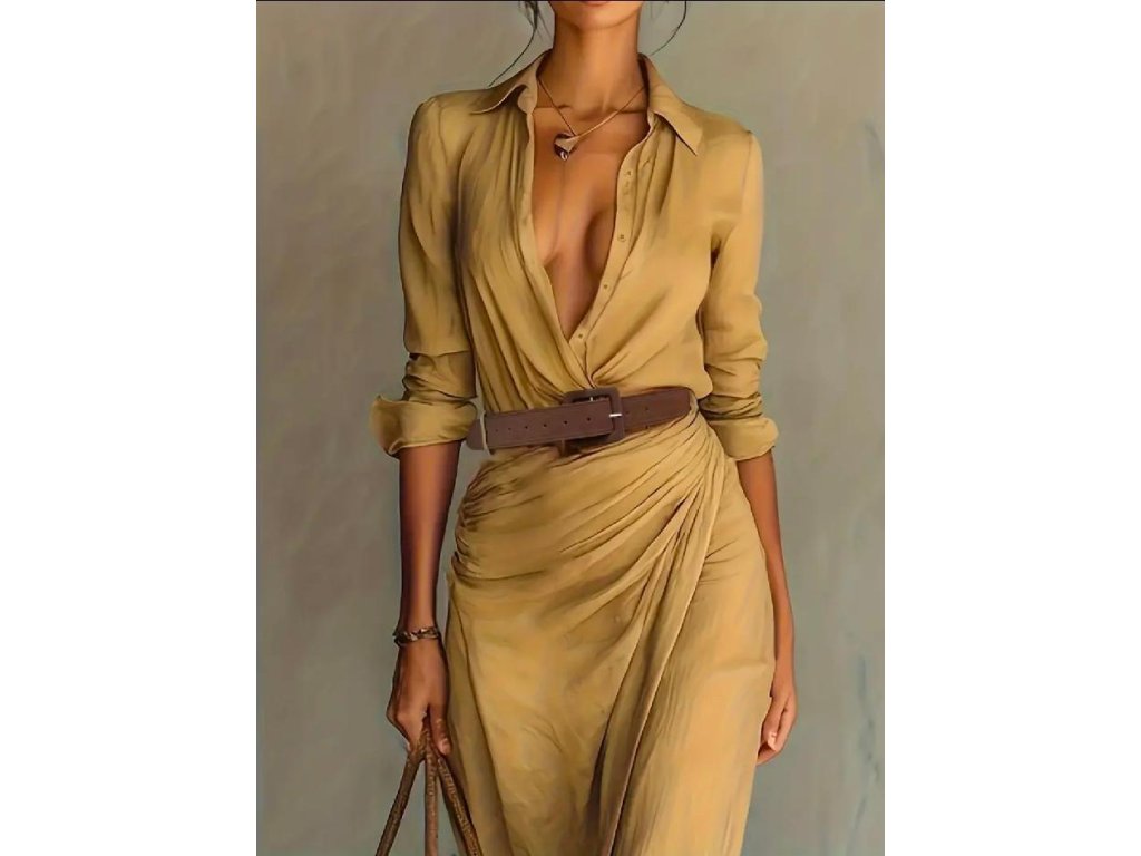 Nadčasové dlouhé šaty v jemném pískovém odstínu, které dokonale spojují ženskost, eleganci a přirozený luxus. Lehce splývavý materiál krásně kopíruje pohyb těla, zatímco rafinované řasení v pase vytváří lichotivou siluetu a zvýrazňuje ženské křivky.