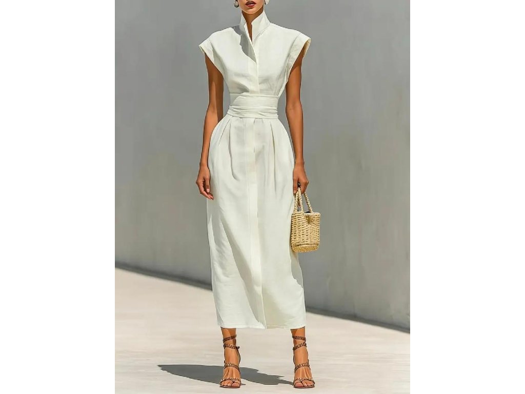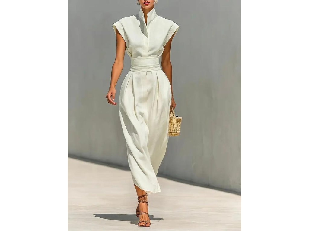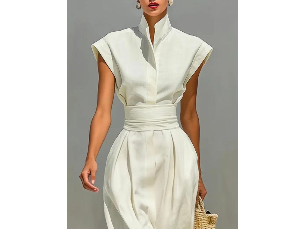 Vyšší stojáček u krku a krátké rukávy dodávají modelu moderní, elegantní vzhled, který se skvěle hodí jak na letní dny ve městě, tak na dovolenou, slavnostní události či stylové pracovní schůzky. Šaty působí luxusně, přesto zůstávají pohodlné a vzdušné.